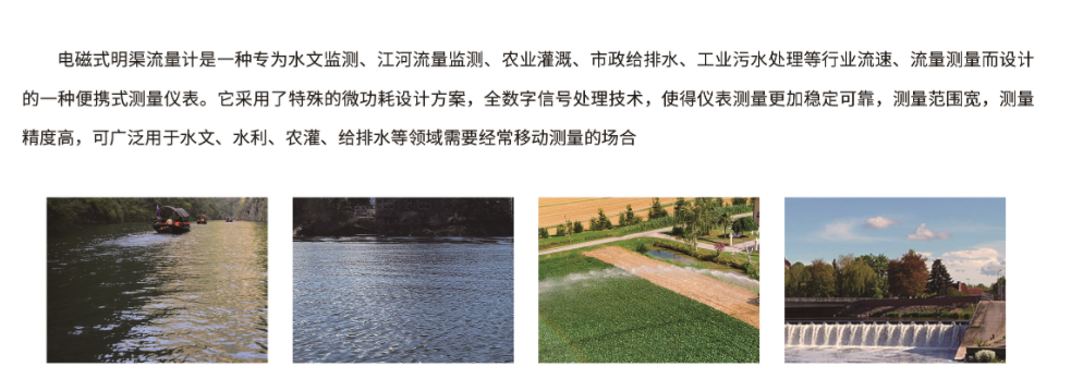 电磁式明渠流量计是一种专为水文监测、江河流量监测、农业灌溉、市政给排水、工业污水处理等行业流速、流量测量而设计的一种便携式测量仪表。它采用了特殊的微功耗设计方案,全数字信号处理技术,使得仪表测量更加稳定可靠,测量范围宽,测量精度高,可广泛用于水文、水利、农灌、给排水等领域需要经常移动测量的场合。
