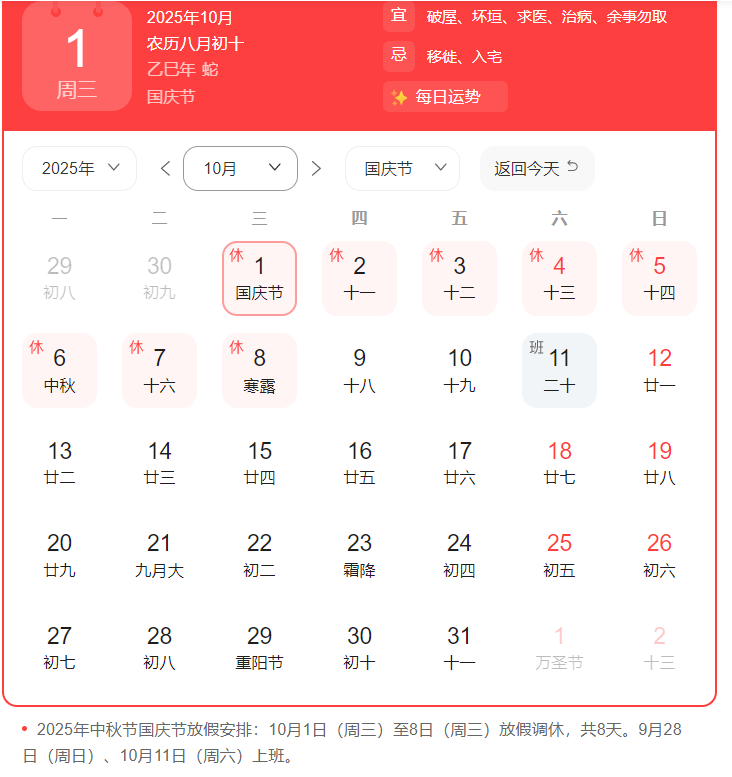 根据国务院办公厅通知精神,结合公司实际,考虑到公司家人们的家庭情况,经公司研究决定,现将2025年中秋节、国庆节放假安排通知如下: