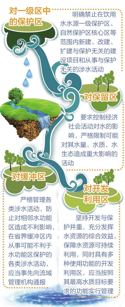 该办法还对水功能区限制纳污管理作了严格规定。石秋池说,为落实国务院对全国重要江河湖泊水功能区的批复要求和全面推行河长制的有关要求,办法将水功能区限制纳污管理作为核心内容,从以下5个方面作了规定: